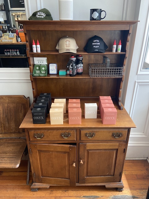 The merchandise that was not directly bicycle-related was mostly stationed at the front on the right side wall. Even some of these items are clearly geared for the outdoors. Note the branded water bottles, for instance. Heritage also carries a small selection of Onyx’s lineup, including the Monarch blend. For anyone looking to try some of Onyx’s beans, I would also recommend the Southern Weather, an excellent medium-roasted blend that tasted good on just about any brewing method.