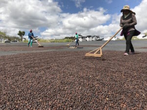 Finally, there’s the “honey” process. This basically splits the difference between “washed” and “natural.” When cherries are “honey” processed, the outer skin of the cherries are still removed with a pulping machine. However, they are not sent to water tanks to be fermented. Instead, they are immediately sent to drying racks or patios with parts of their fruit still intact.