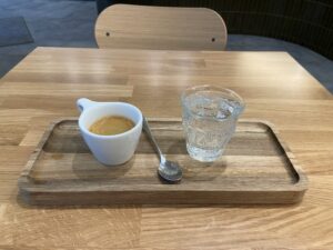 My first order was the house espresso. According to their menu, this was the Maomi Blend, a medium-roasted blend consisting of beans from China, Guatemala, and Mexico. I was delighted when the barista served the coffee in the classic demitasse cup & spoon with a serving of sparkling water on the side. I’ll never get tired of having espresso served this way.